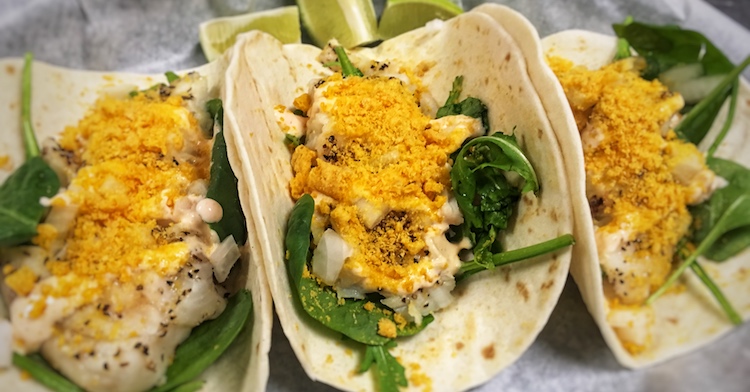 Our Cap’n Crunch Tilapia Tacos start with a grilled tilapia filet on a bed of fresh spinach and arugula. Then we add a bit of spice with a Sriracha crema, some sweetness and crunch from the crushed Cap’n Crunch and diced white onions, and finish everything off with a squirt of lime.